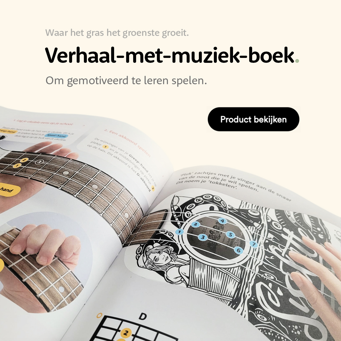 In de doos van jouw ukulele vind je een prachtig verhaal-met-muziek-boek, een cd met liedjes,